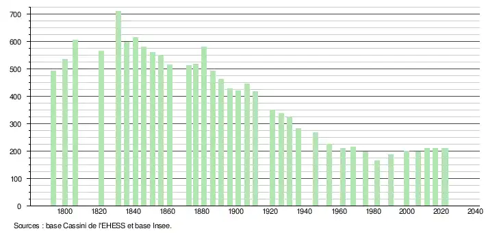 L'évolution du nombre d'habitants est connue à travers les recensements de la population effectués dans la commune depuis 1793. Pour les communes de moins de 10 000 habitants, une enquête de recensement portant sur toute la population est réalisée tous les cinq ans, les populations de référence des années intermédiaires étant quant à elles estimées par interpolation ou extrapolation[29]. Pour la commune, le premier recensement exhaustif entrant dans le cadre du nouveau dispositif a été réalisé en 2006[30].