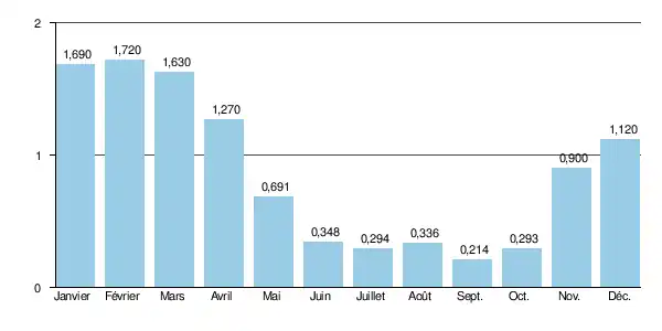 Les crues peuvent être assez importantes, compte tenu de la petitesse du bassin versant. Les QIX 2 et QIX 5 valent respectivement 16 et 23 m3/s. Le QIX 10 est de 27 m3/s, le QIX 20 de 32 m3, tandis que le QIX 50 n'a pas pu être calculé, faute d'une durée d'observation suffisante pour le faire.