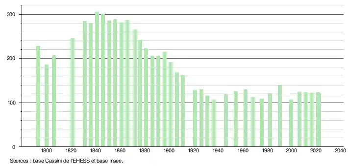 L'évolution du nombre d'habitants est connue à travers les recensements de la population effectués dans la commune depuis 1793. Pour les communes de moins de 10 000 habitants, une enquête de recensement portant sur toute la population est réalisée tous les cinq ans, les populations de référence des années intermédiaires étant quant à elles estimées par interpolation ou extrapolation[25]. Pour la commune, le premier recensement exhaustif entrant dans le cadre du nouveau dispositif a été réalisé en 2006[26].
