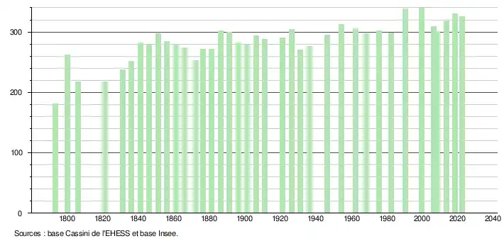 L'évolution du nombre d'habitants est connue à travers les recensements de la population effectués dans la commune depuis 1793. Pour les communes de moins de 10 000 habitants, une enquête de recensement portant sur toute la population est réalisée tous les cinq ans, les populations de référence des années intermédiaires étant quant à elles estimées par interpolation ou extrapolation[37]. Pour la commune, le premier recensement exhaustif entrant dans le cadre du nouveau dispositif a été réalisé en 2008[38].