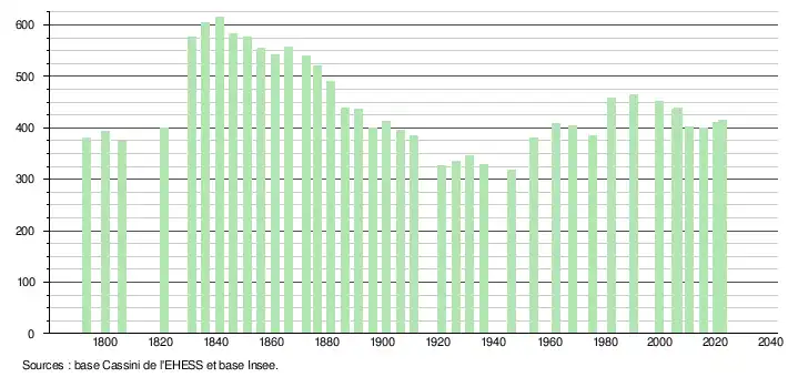 L'évolution du nombre d'habitants est connue à travers les recensements de la population effectués dans la commune depuis 1793. Pour les communes de moins de 10 000 habitants, une enquête de recensement portant sur toute la population est réalisée tous les cinq ans, les populations de référence des années intermédiaires étant quant à elles estimées par interpolation ou extrapolation[38]. Pour la commune, le premier recensement exhaustif entrant dans le cadre du nouveau dispositif a été réalisé en 2005[39].