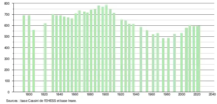 L'évolution du nombre d'habitants est connue à travers les recensements de la population effectués dans la commune depuis 1793. Pour les communes de moins de 10 000 habitants, une enquête de recensement portant sur toute la population est réalisée tous les cinq ans, les populations de référence des années intermédiaires étant quant à elles estimées par interpolation ou extrapolation[16]. Pour la commune, le premier recensement exhaustif entrant dans le cadre du nouveau dispositif a été réalisé en 2005[17].