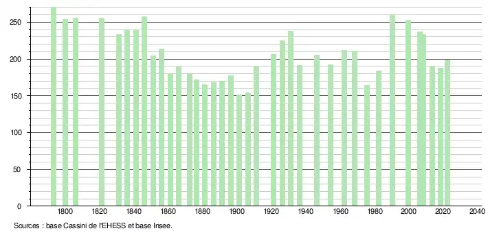 L'évolution du nombre d'habitants est connue à travers les recensements de la population effectués dans la commune depuis 1793. Pour les communes de moins de 10 000 habitants, une enquête de recensement portant sur toute la population est réalisée tous les cinq ans, les populations de référence des années intermédiaires étant quant à elles estimées par interpolation ou extrapolation[18]. Pour la commune, le premier recensement exhaustif entrant dans le cadre du nouveau dispositif a été réalisé en 2008[19].