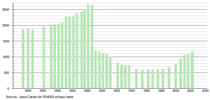 L'évolution du nombre d'habitants est connue à travers les recensements de la population effectués dans la commune depuis 1793. Pour les communes de moins de 10 000 habitants, une enquête de recensement portant sur toute la population est réalisée tous les cinq ans, les populations de référence des années intermédiaires étant quant à elles estimées par interpolation ou extrapolation[13]. Pour la commune, le premier recensement exhaustif entrant dans le cadre du nouveau dispositif a été réalisé en 2006[14].