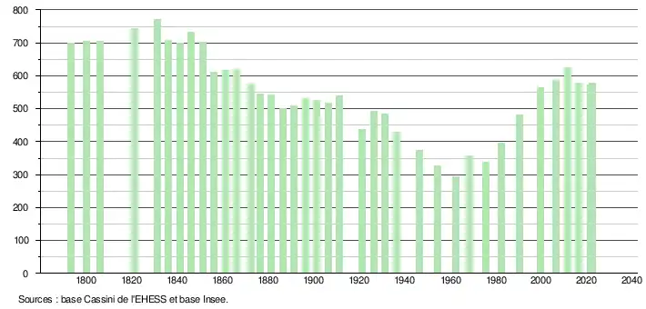 L'évolution du nombre d'habitants est connue à travers les recensements de la population effectués dans la commune depuis 1793. Pour les communes de moins de 10 000 habitants, une enquête de recensement portant sur toute la population est réalisée tous les cinq ans, les populations de référence des années intermédiaires étant quant à elles estimées par interpolation ou extrapolation[51]. Pour la commune, le premier recensement exhaustif entrant dans le cadre du nouveau dispositif a été réalisé en 2006[52].