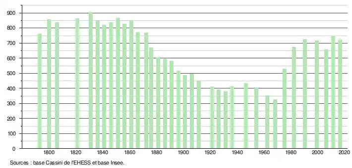 L'évolution du nombre d'habitants est connue à travers les recensements de la population effectués dans la commune depuis 1793. Pour les communes de moins de 10 000 habitants, une enquête de recensement portant sur toute la population est réalisée tous les cinq ans, les populations de référence des années intermédiaires étant quant à elles estimées par interpolation ou extrapolation[10]. Pour la commune, le premier recensement exhaustif entrant dans le cadre du nouveau dispositif a été réalisé en 2006[11].