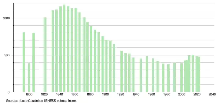 L'évolution du nombre d'habitants est connue à travers les recensements de la population effectués dans la commune depuis 1793. Pour les communes de moins de 10 000 habitants, une enquête de recensement portant sur toute la population est réalisée tous les cinq ans, les populations de référence des années intermédiaires étant quant à elles estimées par interpolation ou extrapolation[22]. Pour la commune, le premier recensement exhaustif entrant dans le cadre du nouveau dispositif a été réalisé en 2004[23].