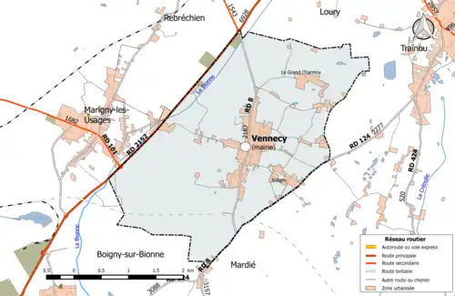 Carte de la commune de Vennecy et des communes limitrophes.