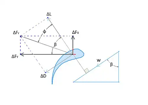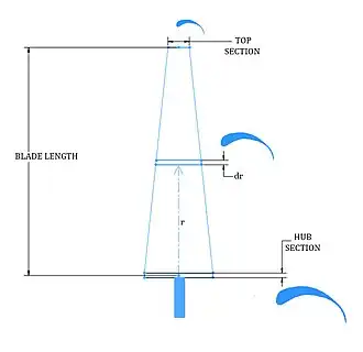 Dans cette théorie, un élément infinitésimal () est pris à une distance du pied de la pale et toutes les forces agissant sur l'élément sont analysées pour obtenir une solution. On suppose que l'écoulement à travers chaque section élémentaire radiale est indépendant de l’écoulement à travers les autres éléments[1],[3].