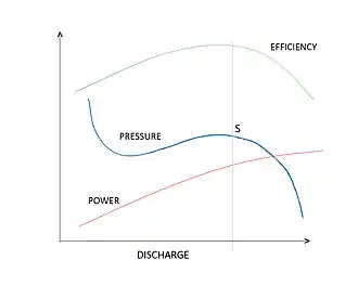 La relation entre le différentiel de pression et le débit volumique est une caractéristique importante des ventilateurs. Les caractéristiques typiques des ventilateurs axiaux peuvent être étudiées à partir des courbes de performances. Une courbe de performances de ventilateur axial est présentée sur la figure. (La ligne verticale joignant le point d'efficacité maximale est tracée et rencontre la courbe de pression au point "S")[1]. On peut faire les observations suivantes: