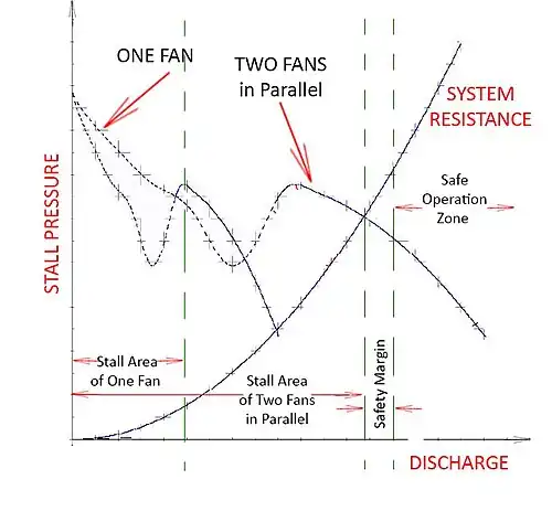 La cause du décrochage est la séparation du flux des surfaces des pales. Cet effet peut s'expliquer par l'écoulement sur un profil aérodynamique aile. Lorsque l'angle d'incidence augmente (lors de l'écoulement à faible vitesse) à l'entrée du profil, le modèle d'écoulement change et une séparation se produit. Il s'agit de la première étape du décrochage. À ce point, le flux se sépare, conduisant à la formation de vortex avec reflux dans la région séparée (voir l'article surtension du compresseur). La zone de décrochage pour le ventilateur axial unique et les ventilateurs axiaux fonctionnant en parallèle est illustrée sur la figure[4].