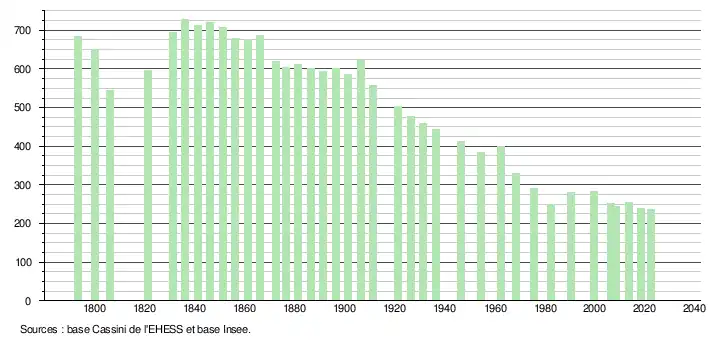 L'évolution du nombre d'habitants est connue à travers les recensements de la population effectués dans la commune depuis 1793. Pour les communes de moins de 10 000 habitants, une enquête de recensement portant sur toute la population est réalisée tous les cinq ans, les populations de référence des années intermédiaires étant quant à elles estimées par interpolation ou extrapolation[25]. Pour la commune, le premier recensement exhaustif entrant dans le cadre du nouveau dispositif a été réalisé en 2008[26].