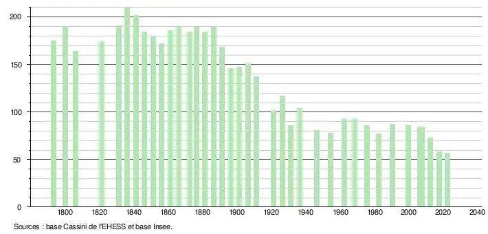L'évolution du nombre d'habitants est connue à travers les recensements de la population effectués dans la commune depuis 1793. Pour les communes de moins de 10 000 habitants, une enquête de recensement portant sur toute la population est réalisée tous les cinq ans, les populations de référence des années intermédiaires étant quant à elles estimées par interpolation ou extrapolation[15]. Pour la commune, le premier recensement exhaustif entrant dans le cadre du nouveau dispositif a été réalisé en 2007[16].