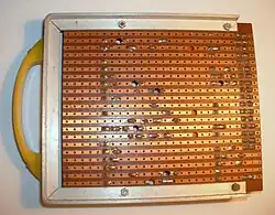 Acheté en plaques de 1,6 mm cuivré, le circuit imprimé a été coupé pour donner des planches d'une taille de 122 × 456 mm puis usiné pour former le produit final selon la spécification originale de Veroboard. Un outil multiple fraiseuse, qui comprend une banque de fraises de côté-et-face avec les dents de coupe de forme adéquate, a été fabriqué puis utilisé pour retirer une partie du cuivre collé sur chaque carte, laissant 21 bandes conductrices[5]. Pour une deuxième opération, un outil spécial avec 63 punch bits durcis de 1,35 mm de diamètre, monté sur un bloc de base solide a été construit pour répéter et poinçonner une matrice de trous, d'un espacement de 5,0 mm, à travers les bandes de cuivre et le substrat.