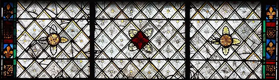 En dehors de ceux occupés par la scène de l'annonciation, tous les panneaux rectangulaires sont ornés en leur centre d'un motif floral réalisé en grisaille sur fond de couleur, entouré de quatre feuilles bordées en ogive, réalisées en grisaille sur fond blanc. Côté gauche, ces panneaux sont irrégulièrement décorés, la fleur pouvant être sur fond bleu, vert ou route, et les feuilles alternant entre feuille de houx, feuille de chêne et feuilles d'orme, sans logique apparente ; et le fond blanc est parcouru d'une subtile volute florale en grisaille. Côté droit, les panneaux centraux portent plus systématiquement une fleur rouge de grisaille entourée par quatre feuilles de chêne, et les panneaux latéraux une fleur jaune entourée de feuilles de houx ; et le fond est formé de losanges de verre blanc, décorés d'un motif floral en grisaille au cœur de jaune d'argent, et bordés par une résille de verre jaune. Dans les deux cas, le cœur des fleurs forme à chaque fois un motif unique.