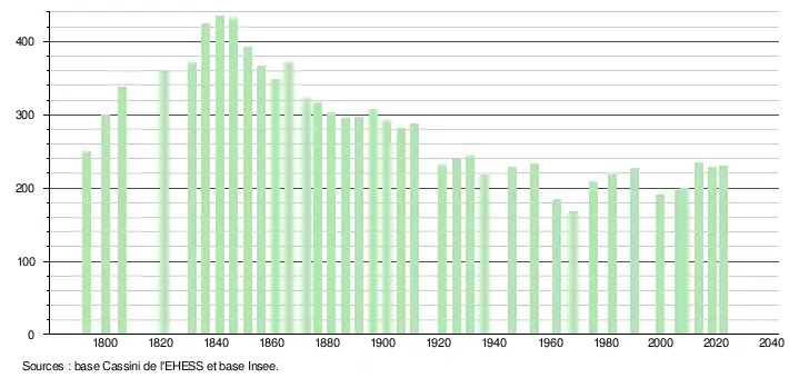 L'évolution du nombre d'habitants est connue à travers les recensements de la population effectués dans la commune depuis 1793. Pour les communes de moins de 10 000 habitants, une enquête de recensement portant sur toute la population est réalisée tous les cinq ans, les populations de référence des années intermédiaires étant quant à elles estimées par interpolation ou extrapolation[15]. Pour la commune, le premier recensement exhaustif entrant dans le cadre du nouveau dispositif a été réalisé en 2008[16].