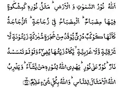 Le verset de la lumière (en arabe : آية النور, āyat an-nūr) est le 35e verset de la 24e sourate du Coran, à laquelle il a donné son nom de sourate An-Nur[3]. Ce verset assimile Allah à la lumière. Connu pour son symbolisme, il se prête aux lectures mystiques ou ésotériques du Coran (en) (taʾwīl). Il était très couramment utilisé dans la décoration des lampes de mosquée (en).