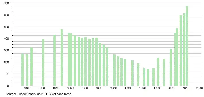 L'évolution du nombre d'habitants est connue à travers les recensements de la population effectués dans la commune depuis 1793. Pour les communes de moins de 10 000 habitants, une enquête de recensement portant sur toute la population est réalisée tous les cinq ans, les populations de référence des années intermédiaires étant quant à elles estimées par interpolation ou extrapolation[7]. Pour la commune, le premier recensement exhaustif entrant dans le cadre du nouveau dispositif a été réalisé en 2008[8].