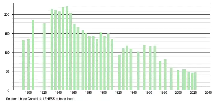 L'évolution du nombre d'habitants est connue à travers les recensements de la population effectués dans la commune depuis 1793. Pour les communes de moins de 10 000 habitants, une enquête de recensement portant sur toute la population est réalisée tous les cinq ans, les populations de référence des années intermédiaires étant quant à elles estimées par interpolation ou extrapolation[16]. Pour la commune, le premier recensement exhaustif entrant dans le cadre du nouveau dispositif a été réalisé en 2008[17].
