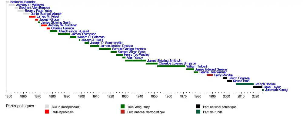 - ↑ Le président Edward James Roye est démis de force de ses fonctions le . Le vice-président Smith prête serment et achève les deux mois restants de la présidence de Roye sans vice-président.