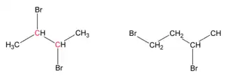 De la même façon, dans un gem-dibromure, le préfixe gem, une abréviation de géminal, signale que les deux atomes de brome sont situés sur le même atome. Par exemple, le 1,1-dibromobutane est géminal.