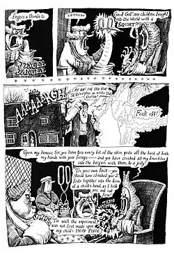 Le Dr Slop, avec sa perruque en feu, gesticulant avec colère vers Sus Wellcome