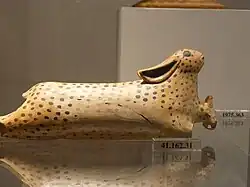 - le brûle-parfum, un chariot cultuel thériomorphe[12] (figure zoomorphe mélange de corps d'oiseau, têtes de cerfs, le tout monté sur roues, exposé à Tarquinia)[13]