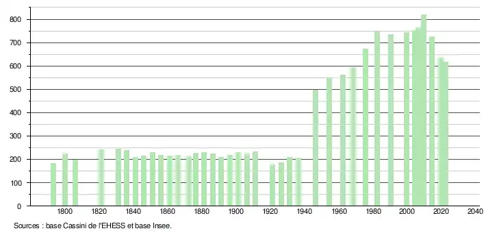 L'évolution du nombre d'habitants est connue à travers les recensements de la population effectués dans la commune depuis 1793. Pour les communes de moins de 10 000 habitants, une enquête de recensement portant sur toute la population est réalisée tous les cinq ans, les populations de référence des années intermédiaires étant quant à elles estimées par interpolation ou extrapolation[16]. Pour la commune, le premier recensement exhaustif entrant dans le cadre du nouveau dispositif a été réalisé en 2004[17].