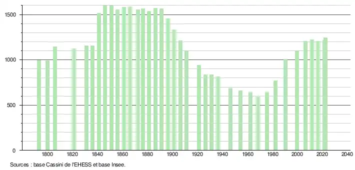 L'évolution du nombre d'habitants est connue à travers les recensements de la population effectués dans la commune depuis 1793. Pour les communes de moins de 10 000 habitants, une enquête de recensement portant sur toute la population est réalisée tous les cinq ans, les populations de référence des années intermédiaires étant quant à elles estimées par interpolation ou extrapolation[18]. Pour la commune, le premier recensement exhaustif entrant dans le cadre du nouveau dispositif a été réalisé en 2006[19].