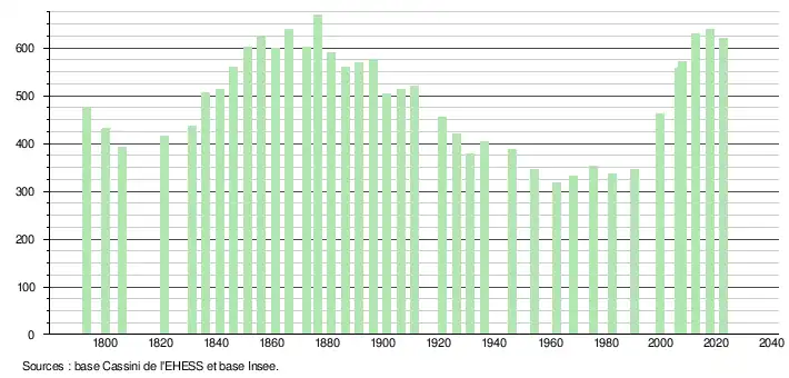 - ↑ Fiches Insee - Populations de référence de la commune pour les années 2006, 2007, 2008, 2009, 2010, 2011, 2012, 2013, 2014, 2015, 2016, 2017, 2018, 2019, 2020, 2021 et 2022.