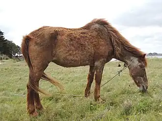 Une maladie typique du cheval âgé est le syndrome de Cushing, causé par une augmentation de cortisone dans le sang. Elle peut être détectée par l'aspect hirsute du pelage, une transpiration et une urine excessives. Sans remède, la maladie peut toutefois être atténuée. Le syndrome métabolique équin, proche de la précédente, est une autre maladie typique provoquant l'obésité et une fourbure. La restriction de l'apport en glucides et l'exercice peuvent l'atténuer[44].