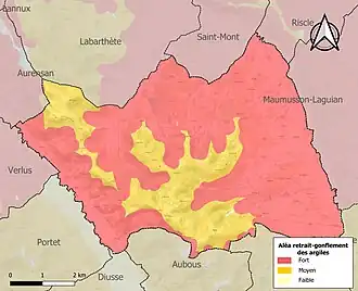 Le retrait-gonflement des sols argileux est susceptible d'engendrer des dommages importants aux bâtiments en cas d’alternance de périodes de sécheresse et de pluie. 99,9 % de la superficie communale est en aléa moyen ou fort (94,5 % au niveau départemental et 48,5 % au niveau national). Sur les 352 bâtiments dénombrés sur la commune en 2019, 352 sont en aléa moyen ou fort, soit 100 %, à comparer aux 93 % au niveau départemental et 54 % au niveau national. Une cartographie de l'exposition du territoire national au retrait gonflement des sols argileux est disponible sur le site du BRGM[17],[Carte 2].
