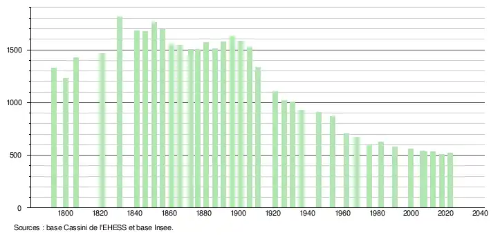| L'évolution du nombre d'habitants est connue à travers les recensements de la population effectués dans la commune depuis 1793. Pour les communes de moins de 10 000 habitants, une enquête de recensement portant sur toute la population est réalisée tous les cinq ans, les populations de référence des années intermédiaires étant quant à elles estimées par interpolation ou extrapolation[22]. Pour la commune, le premier recensement exhaustif entrant dans le cadre du nouveau dispositif a été réalisé en 2007[23]. En 2022, la commune comptait 523 habitants[Note 1], en évolution de +0,58 % par rapport à 2016 (Gers : +1,04 %, France hors Mayotte : +2,11 %). |