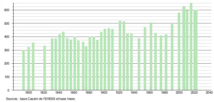 L'évolution du nombre d'habitants est connue à travers les recensements de la population effectués dans la commune depuis 1793. Pour les communes de moins de 10 000 habitants, une enquête de recensement portant sur toute la population est réalisée tous les cinq ans, les populations de référence des années intermédiaires étant quant à elles estimées par interpolation ou extrapolation[28]. Pour la commune, le premier recensement exhaustif entrant dans le cadre du nouveau dispositif a été réalisé en 2005[29].