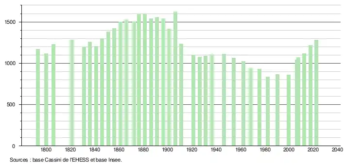 L'évolution du nombre d'habitants est connue à travers les recensements de la population effectués dans la commune depuis 1793. Pour les communes de moins de 10 000 habitants, une enquête de recensement portant sur toute la population est réalisée tous les cinq ans, les populations de référence des années intermédiaires étant quant à elles estimées par interpolation ou extrapolation[26]. Pour la commune, le premier recensement exhaustif entrant dans le cadre du nouveau dispositif a été réalisé en 2007[27].
