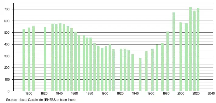 L'évolution du nombre d'habitants est connue à travers les recensements de la population effectués dans la commune depuis 1793. Pour les communes de moins de 10 000 habitants, une enquête de recensement portant sur toute la population est réalisée tous les cinq ans, les populations de référence des années intermédiaires étant quant à elles estimées par interpolation ou extrapolation[34]. Pour la commune, le premier recensement exhaustif entrant dans le cadre du nouveau dispositif a été réalisé en 2007[35].