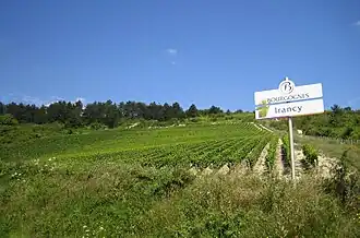 - Irancy : la surface totale plantée est de 160 hectares[1]. Irancy est situé sur les communes d'Irancy, de Cravant et de Vincelottes à environ 15 kilomètres au sud-est d'Auxerre. On y produit exclusivement du vin rouge.