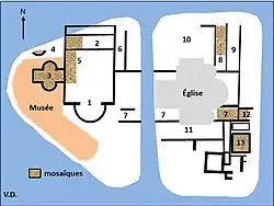 En 1966, à l’occasion de la réfection de la clôture du site, l’archéologue Marc Gauthier dégage l’angle nord-ouest de la pièce précédant la grande salle à abside. Il y trouve un sol de mosaïque en motif d’octogone, en partie défoncé par deux tombes[19].