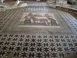 Mosaïque où on peut observer la tâche laissée par un feu au moment de l'abandon de la villa.