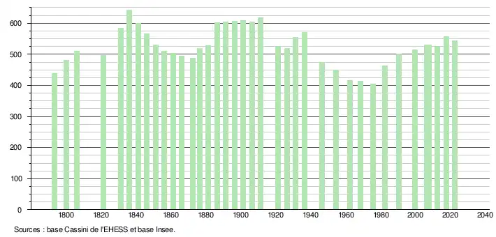 L'évolution du nombre d'habitants est connue à travers les recensements de la population effectués dans la commune depuis 1793. Pour les communes de moins de 10 000 habitants, une enquête de recensement portant sur toute la population est réalisée tous les cinq ans, les populations de référence des années intermédiaires étant quant à elles estimées par interpolation ou extrapolation[12]. Pour la commune, le premier recensement exhaustif entrant dans le cadre du nouveau dispositif a été réalisé en 2007[13].