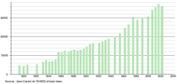 5. Par convention dans Wikipédia, le principe a été retenu de n’afficher dans le tableau des recensements et le graphique, pour les populations de référence postérieures à 1999, que les populations correspondant à une enquête exhaustive de recensement pour les communes de moins de 10 000 habitants, et que les populations des années 2006, 2011, 2016, etc. pour les communes de plus de 10 000 habitants, ainsi que la dernière population de référence publiée par l’Insee pour l'ensemble des communes.