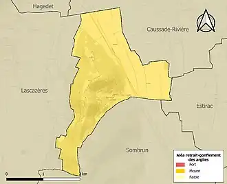 Le retrait-gonflement des sols argileux est susceptible d'engendrer des dommages importants aux bâtiments en cas d’alternance de périodes de sécheresse et de pluie. La totalité de la commune est en aléa moyen ou fort (44,5 % au niveau départemental et 48,5 % au niveau national). Sur les 54 bâtiments dénombrés sur la commune en 2019, 54 sont en aléa moyen ou fort, soit 100 %, à comparer aux 75 % au niveau départemental et 54 % au niveau national. Une cartographie de l'exposition du territoire national au retrait gonflement des sols argileux est disponible sur le site du BRGM[20],[Carte 3].