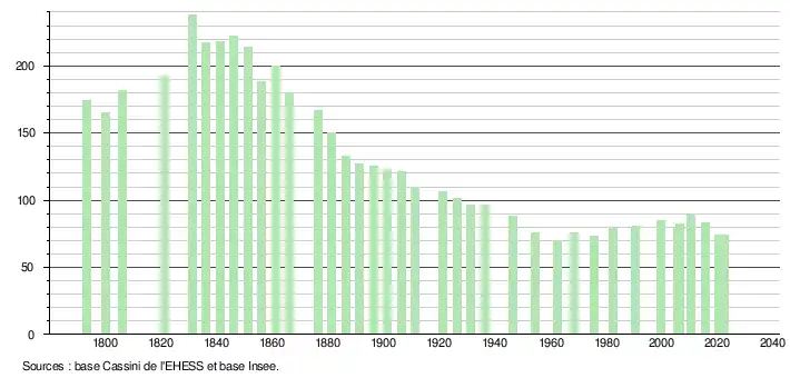 | L'évolution du nombre d'habitants est connue à travers les recensements de la population effectués dans la commune depuis 1793. Pour les communes de moins de 10 000 habitants, une enquête de recensement portant sur toute la population est réalisée tous les cinq ans, les populations de référence des années intermédiaires étant quant à elles estimées par interpolation ou extrapolation[27]. Pour la commune, le premier recensement exhaustif entrant dans le cadre du nouveau dispositif a été réalisé en 2005[28]. En 2022, la commune comptait 74 habitants[Note 3], en évolution de −8,64 % par rapport à 2016 (Hautes-Pyrénées : +1,59 %, France hors Mayotte : +2,11 %). |