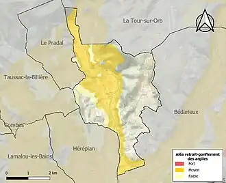 Le retrait-gonflement des sols argileux est susceptible d'engendrer des dommages importants aux bâtiments en cas d’alternance de périodes de sécheresse et de pluie. 44,7 % de la superficie communale est en aléa moyen ou fort (59,3 % au niveau départemental et 48,5 % au niveau national). Sur les 271 bâtiments dénombrés sur la commune en 2019, 234 sont en aléa moyen ou fort, soit 86 %, à comparer aux 85 % au niveau départemental et 54 % au niveau national. Une cartographie de l'exposition du territoire national au retrait gonflement des sols argileux est disponible sur le site du BRGM[19],[Carte 2].