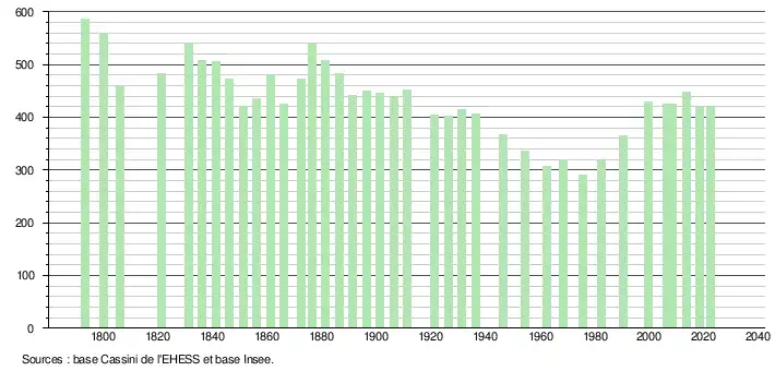 L'évolution du nombre d'habitants est connue à travers les recensements de la population effectués dans la commune depuis 1793. Pour les communes de moins de 10 000 habitants, une enquête de recensement portant sur toute la population est réalisée tous les cinq ans, les populations de référence des années intermédiaires étant quant à elles estimées par interpolation ou extrapolation[26]. Pour la commune, le premier recensement exhaustif entrant dans le cadre du nouveau dispositif a été réalisé en 2008[27].