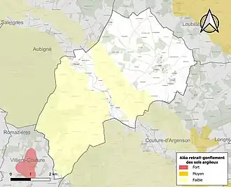 Les mouvements de terrains susceptibles de se produire sur la commune sont des tassements différentiels[17]. Le retrait-gonflement des sols argileux est susceptible d'engendrer des dommages importants aux bâtiments en cas d’alternance de périodes de sécheresse et de pluie[18]. Aucune partie du territoire de la commune n'est en aléa moyen ou fort (54,9 % au niveau départemental et 48,5 % au niveau national)[Carte 2]. Depuis le , en application de la loi ELAN, différentes contraintes s'imposent aux vendeurs, maîtres d'ouvrages ou constructeurs de biens situés dans une zone classée en aléa moyen ou fort[Note 1],[19].
