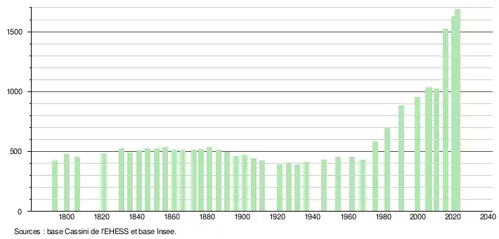 L'évolution du nombre d'habitants est connue à travers les recensements de la population effectués dans la commune depuis 1793. Pour les communes de moins de 10 000 habitants, une enquête de recensement portant sur toute la population est réalisée tous les cinq ans, les populations de référence des années intermédiaires étant quant à elles estimées par interpolation ou extrapolation[31]. Pour la commune, le premier recensement exhaustif entrant dans le cadre du nouveau dispositif a été réalisé en 2005[32].