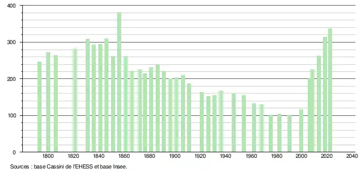 | L'évolution du nombre d'habitants est connue à travers les recensements de la population effectués dans la commune depuis 1793. Pour les communes de moins de 10 000 habitants, une enquête de recensement portant sur toute la population est réalisée tous les cinq ans, les populations de référence des années intermédiaires étant quant à elles estimées par interpolation ou extrapolation[22]. Pour la commune, le premier recensement exhaustif entrant dans le cadre du nouveau dispositif a été réalisé en 2008[23]. En 2022, la commune comptait 337 habitants[Note 2], en évolution de +17,83 % par rapport à 2016 (Aude : +2,65 %, France hors Mayotte : +2,11 %). |