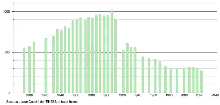 L'évolution du nombre d'habitants est connue à travers les recensements de la population effectués dans la commune depuis 1793. Pour les communes de moins de 10 000 habitants, une enquête de recensement portant sur toute la population est réalisée tous les cinq ans, les populations de référence des années intermédiaires étant quant à elles estimées par interpolation ou extrapolation[24]. Pour la commune, le premier recensement exhaustif entrant dans le cadre du nouveau dispositif a été réalisé en 2006[25].