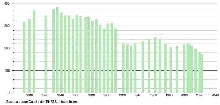 L'évolution du nombre d'habitants est connue à travers les recensements de la population effectués dans la commune depuis 1793. Pour les communes de moins de 10 000 habitants, une enquête de recensement portant sur toute la population est réalisée tous les cinq ans, les populations de référence des années intermédiaires étant quant à elles estimées par interpolation ou extrapolation[29]. Pour la commune, le premier recensement exhaustif entrant dans le cadre du nouveau dispositif a été réalisé en 2004[30].